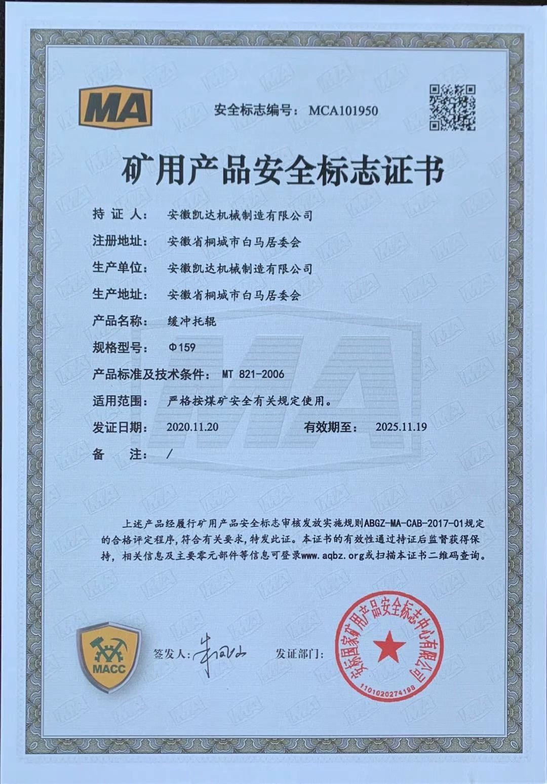 礦用產(chǎn)品安全標志證書(shū)-緩沖托輥4