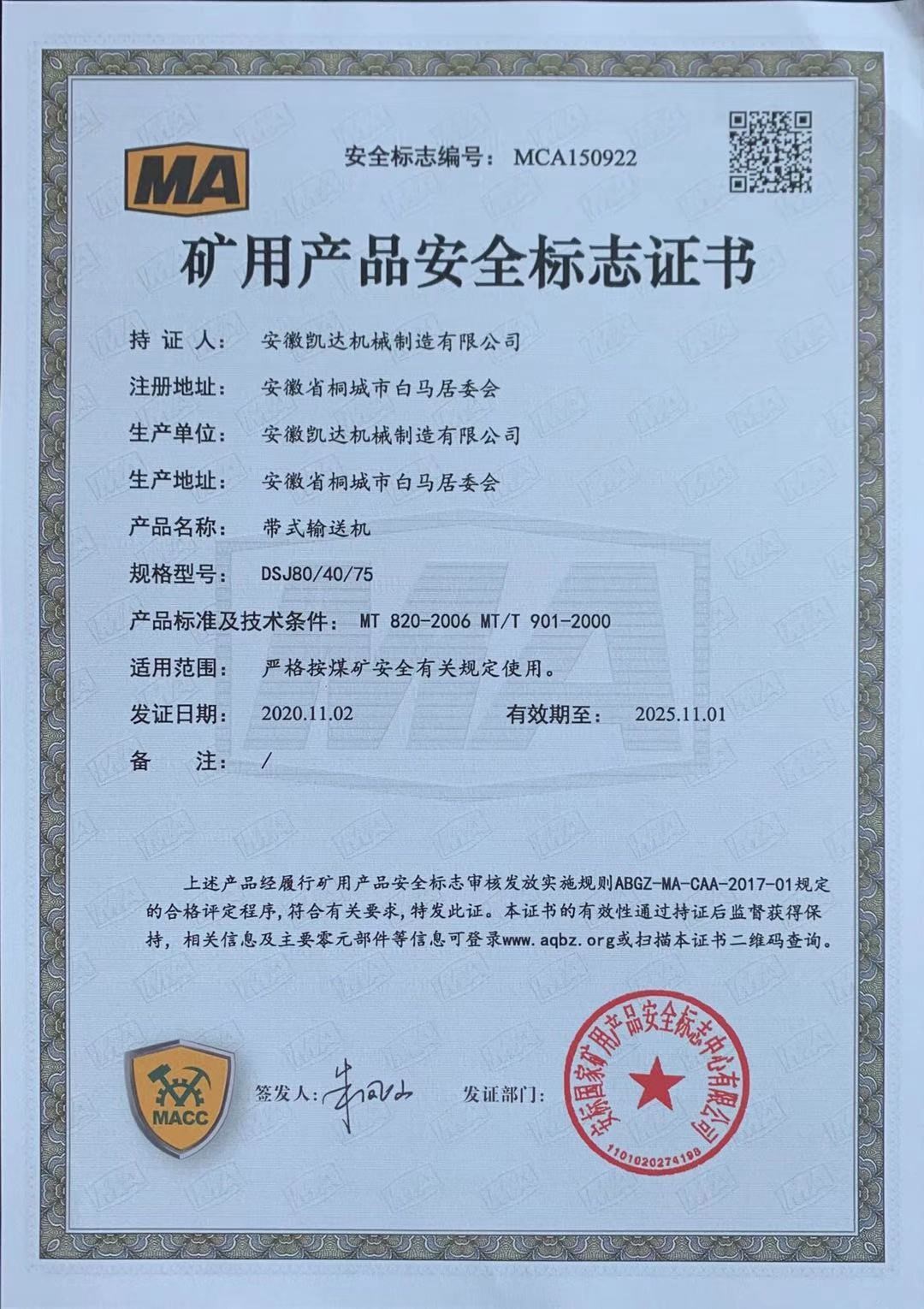 礦用產(chǎn)品安全標志證書(shū)-帶式輸送機50