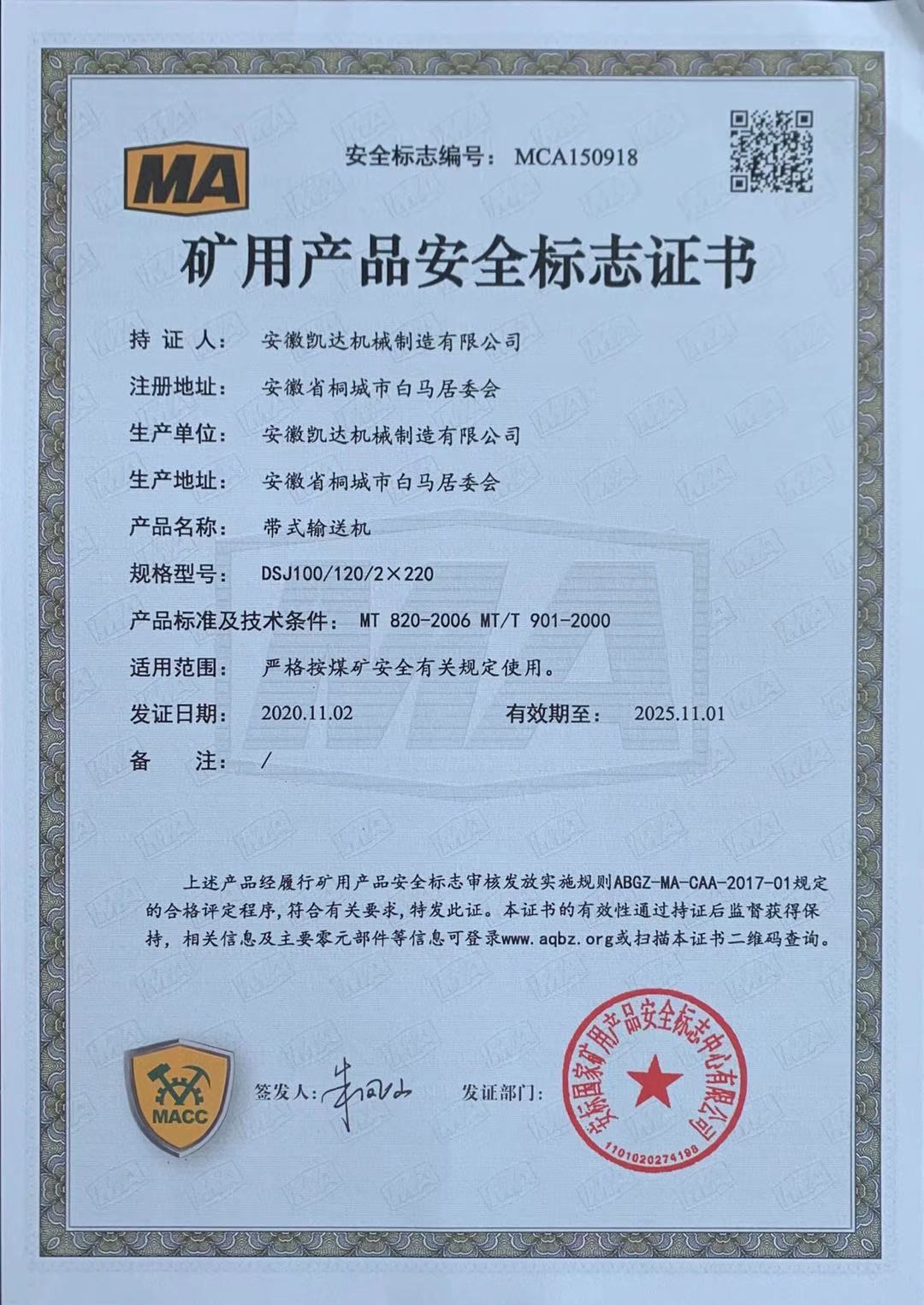 礦用產(chǎn)品安全標志證書(shū)-帶式輸送機46