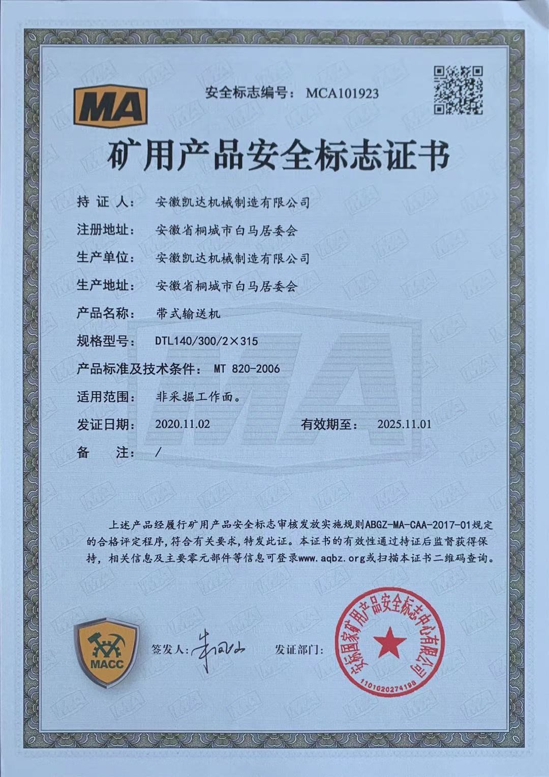 礦用產(chǎn)品安全標志證書(shū)-帶式輸送機12