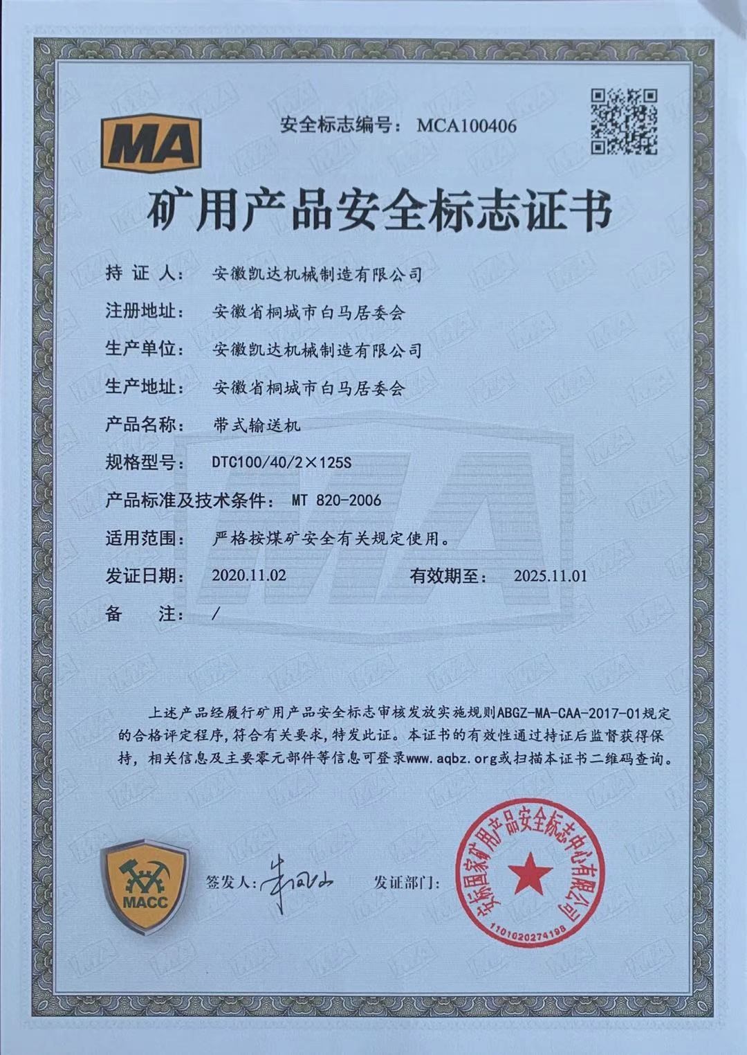 礦用產(chǎn)品安全標志證書(shū)-帶式輸送機9
