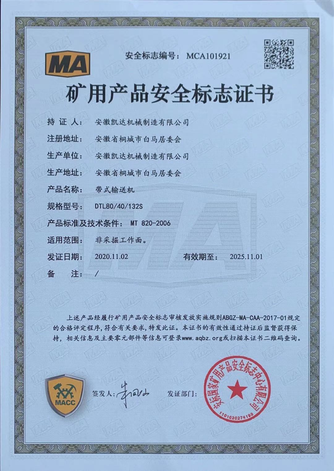礦用產(chǎn)品安全標志證書(shū)-帶式輸送機10