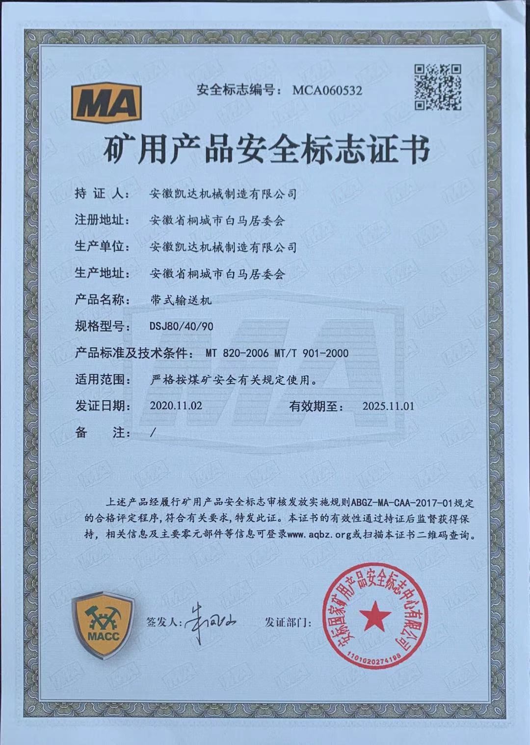礦用產(chǎn)品安全標志證書(shū)-帶式輸送機5