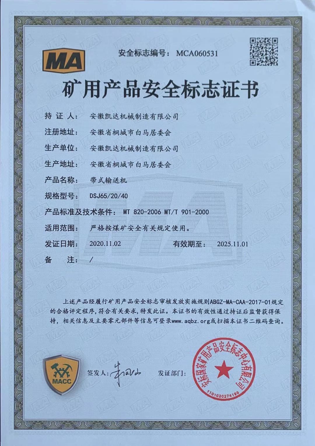 礦用產(chǎn)品安全標志證書(shū)-帶式輸送機4