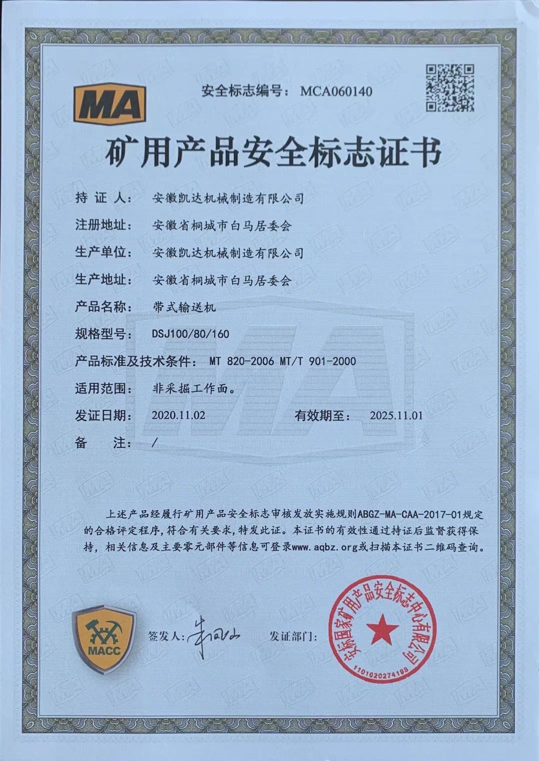 礦用產(chǎn)品安全標志證書(shū)-帶式輸送機1
